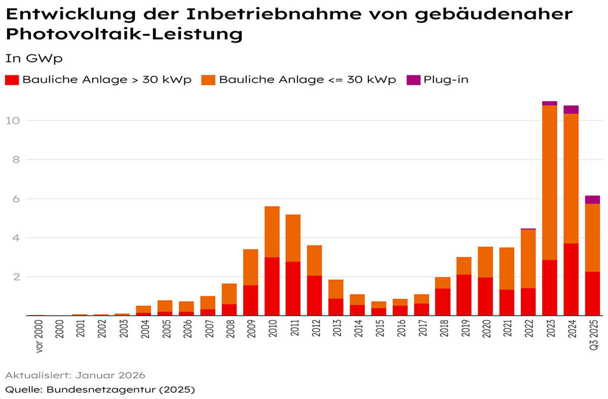 Der Zubau von Dach-PV ließ 2025 deutlich nach. Mit 6,2 Gigawatt neu installierter Leistung bis September ist er weiterhin hoch, bleibt aber deutlich hinter den Rekordjahren 2023 und 2024 zurück. Gleichzeitig zeigt der Speichermarkt ungebrochene Dynamik: Immer mehr Eigenheimbesitzende installieren Solarstromspeicher, um ihren Solarstrom besser selbst nutzen zu können. Bis September wurden rund 3 Gigawatt-Peak neu installiert, wodurch die gesamte Speicherleistung auf etwa 15,6 Gigawatt stieg.